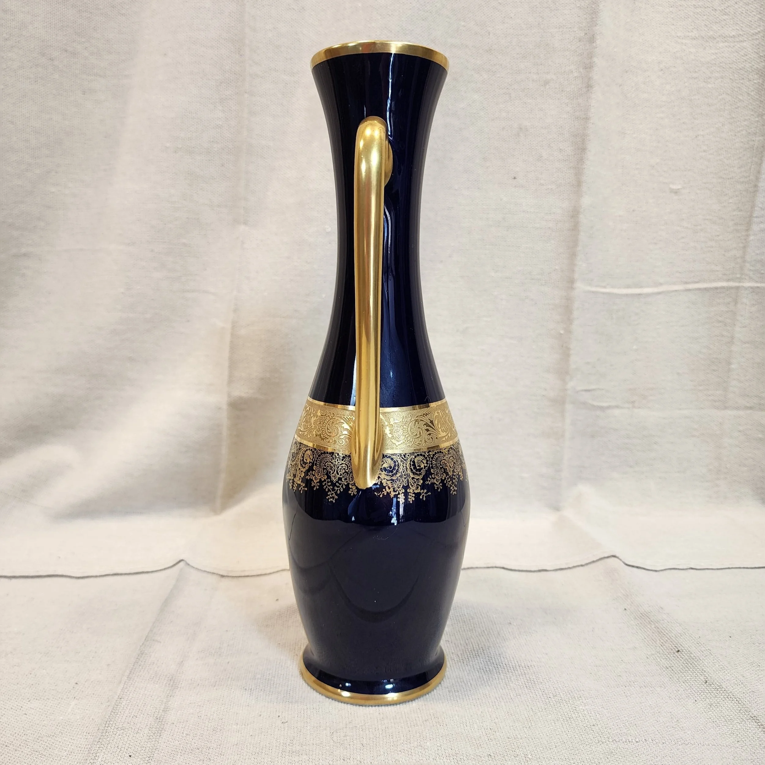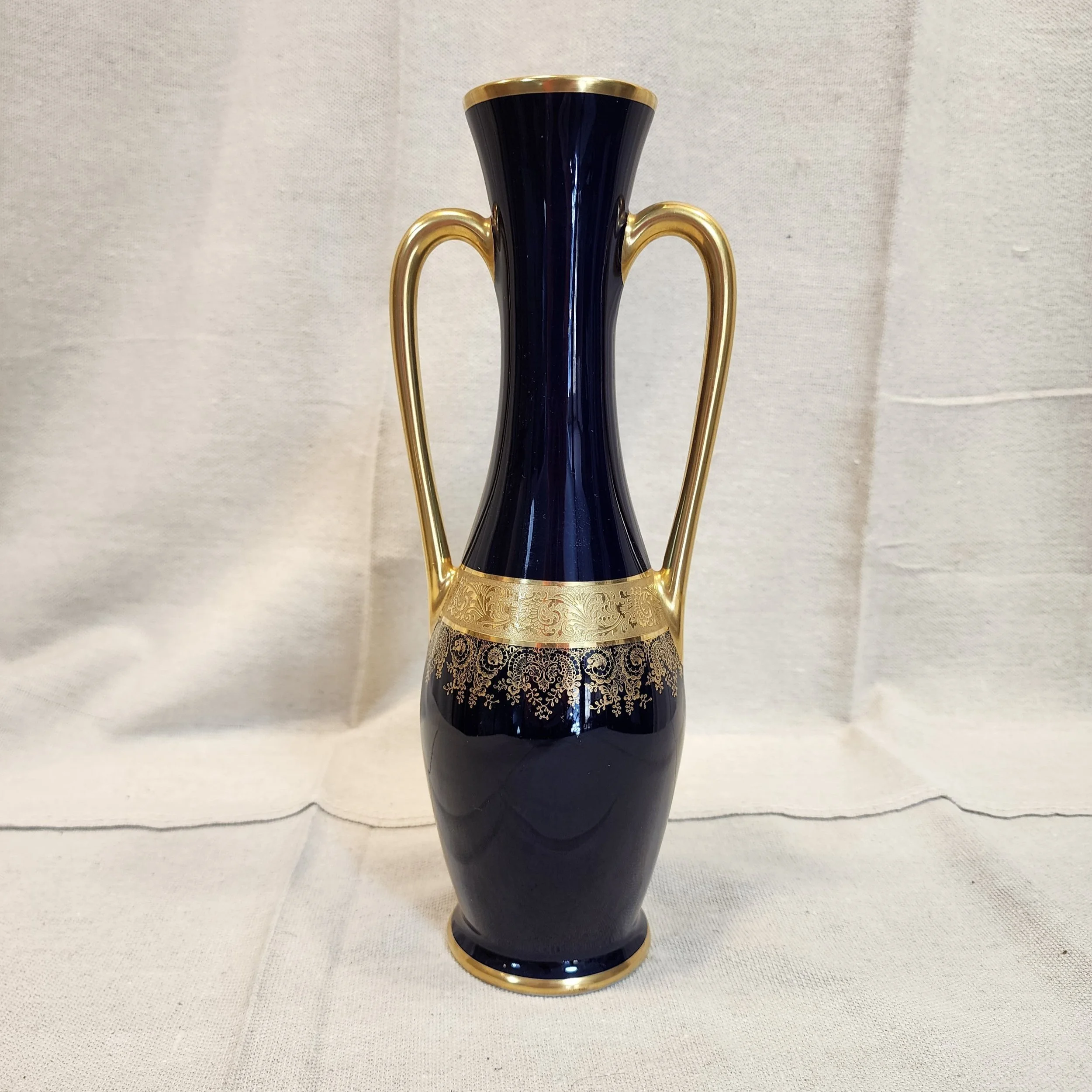This unusual amphora shaped vase has double inlayed 22 karat gold decoration over the rich, opaque cobalt glaze and is circa the mid 20th century. The shape and the decoration give this vase a classic distinction.