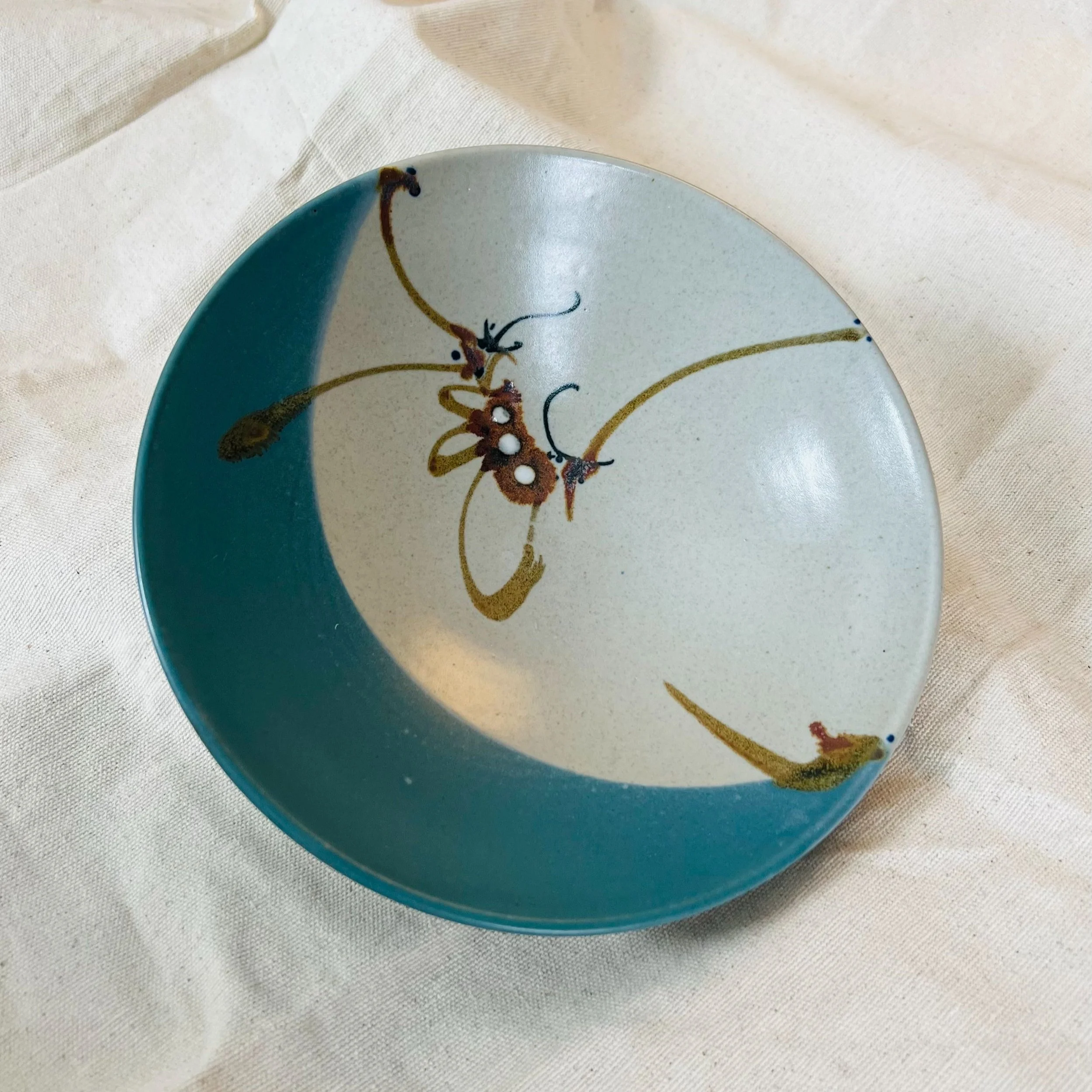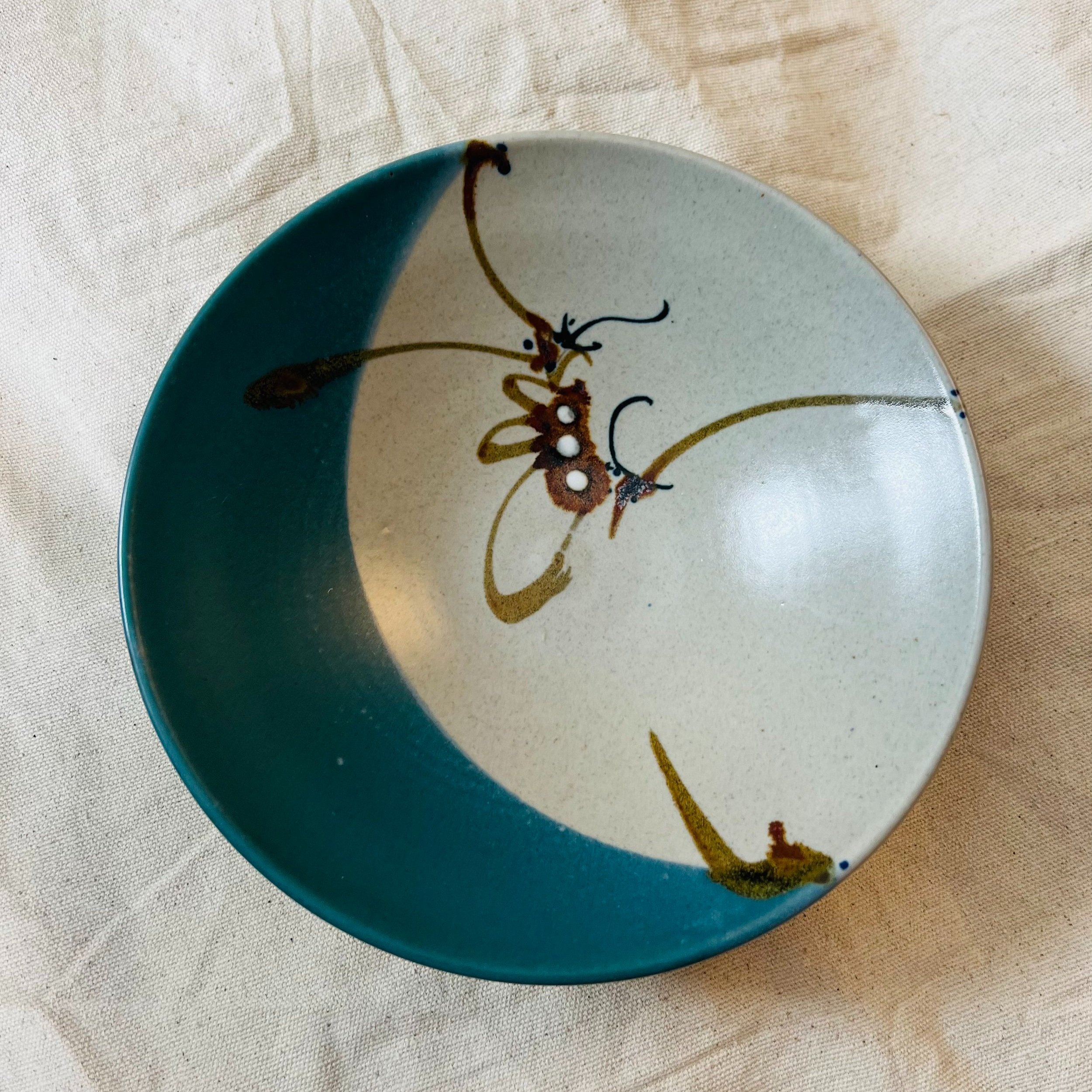A large vintage studio pottery bowl with a whimsically, hand painted caterpillar resting on a fragile branch. Colors are vivid blue on an oyster field with the insect in rust, ochre, black and white.